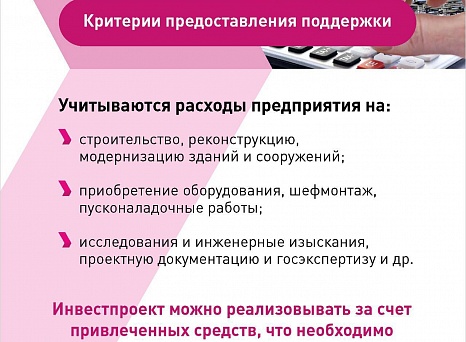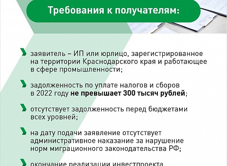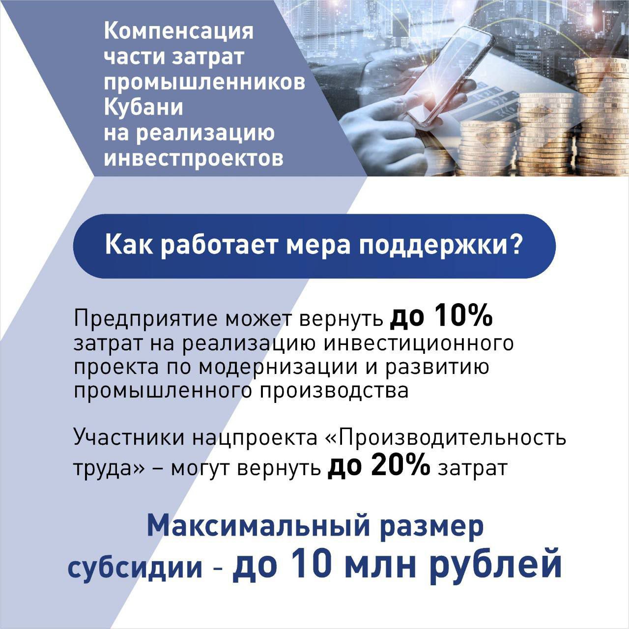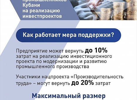 В Краснодарском крае действует мера поддержки инвесторов, реализующих проекты в отрасли промышленности. Как получить компенсацию части затрат – информация в карточках.